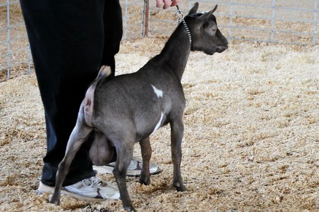 Melee is one of the very beautiful does we purchased from Ben and Kate Helms. She’s a very (very) dairy doe, with a gorgeous udder (high, wide, very easy to milk and has great lateral attachments). We still have her Gdam, “Queen” (a 5x GCH, BU, BOB, BIS doe) who came to us as an older, retired. doe. I was the tester of Queen when she was in her prime—-and WOW— she had such a great udder and one of the best milkers I’d seen. Over the years, we ended up with several of her daughters, the most favorite, of course is SGCH Priesty EEEE91—-Top 10 Milker (1292#), 4x GCH, 2X BOB, Total Performer, JuJu Platinum, Grand, & Gold Award winner (2016 & 2017).